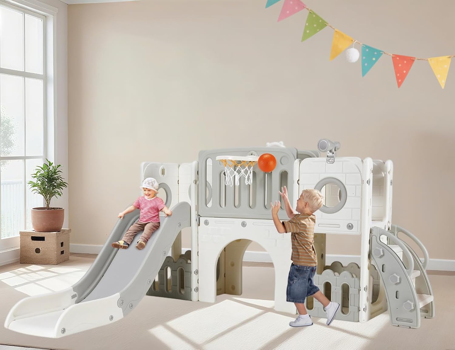9 in 1 Toddler Slide Set, Kids Climber Slide Playset w/Long Slope, Telescope, Storage Space, Enclosed Steps, Indoor Outdoor Playground for Age 3+ Years Old (White & Gray)
