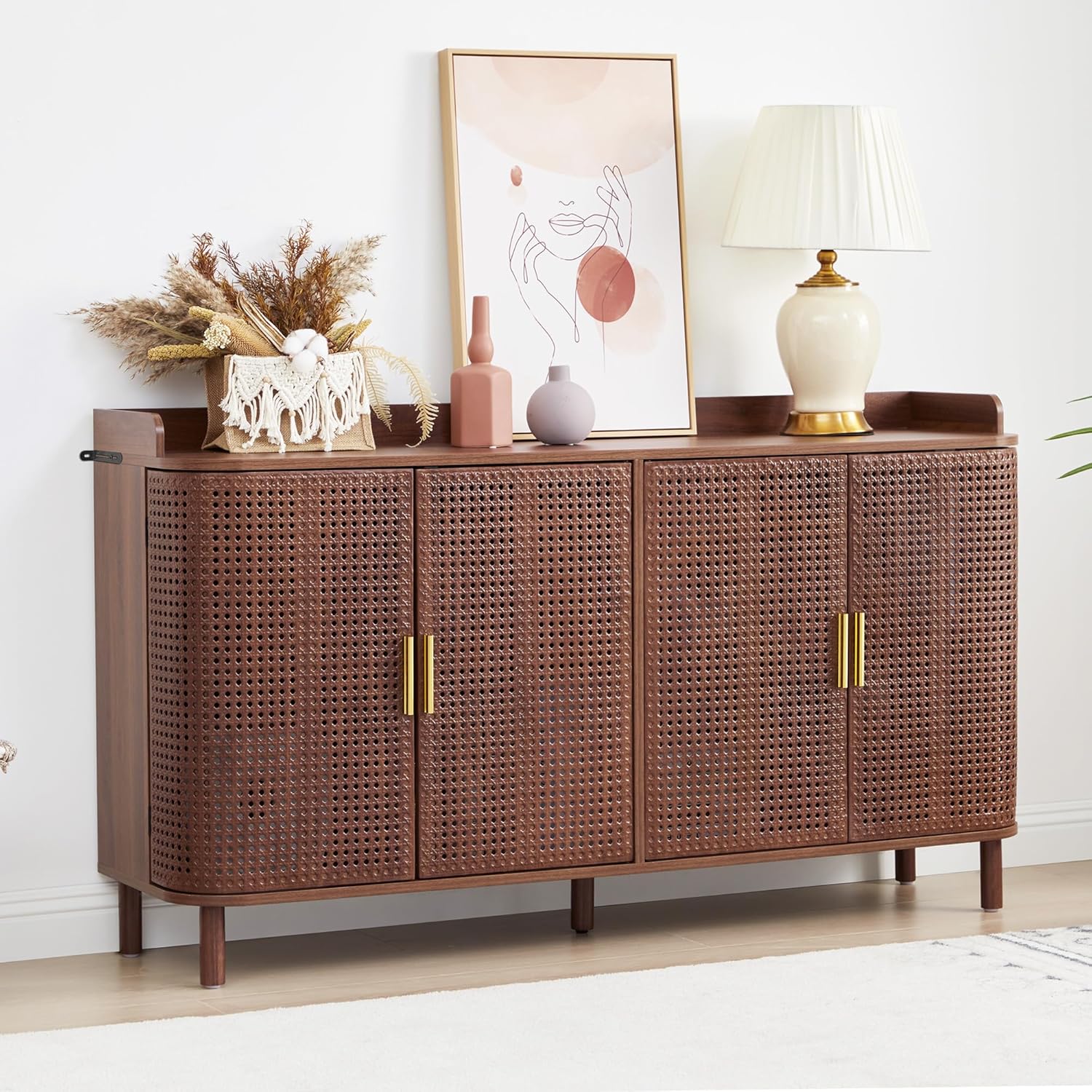 Shoe Cabinet, 5 Tier Boho Wooden Shoe Storage Organizer Cabinet with Adjustable Shelves, Shoes Rack with Iron Rattan Curved Doors Accent Cabinet for Entryway Hallway Living Room, Walnut