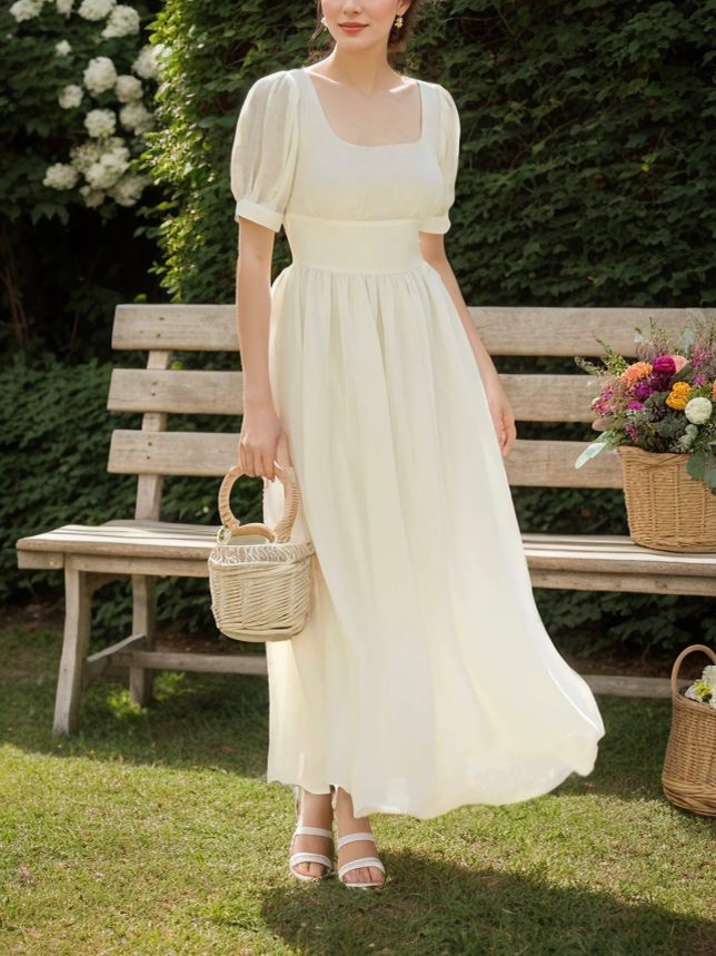 Linen Maxi Dress, Puff Sleeve, Short Sleeve, Square Neck, Vintage Dress, Linen, White