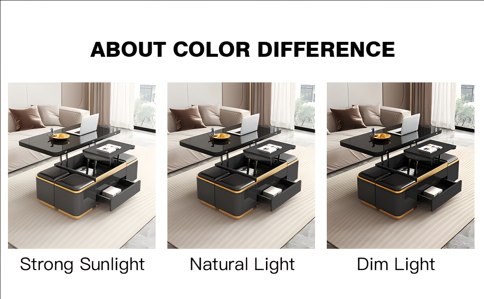 We know online shopping can be tricky with colors! The table’s black finish might look slightly different in strong sunlight, natural light, or dim light—just like any glossy furniture. But rest easy: the rich black and subtle gold trim will still look sleek no matter your room’s lighting. It’s the kind of piece that adapts to your space, not the other way around.