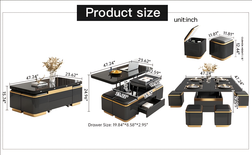 Tired of juggling a coffee table that only holds mugs, a dining table that takes up half the living room, and a desk that’s too flimsy for work? Meet your new space-saving hero: this retractable lifting coffee table set with 4 storage stools. It’s a coffee table, office desk, and 8-person dining table in one—perfect for your living room, office, or cozy small space. No more cluttered rooms, no more compromising on style or function.